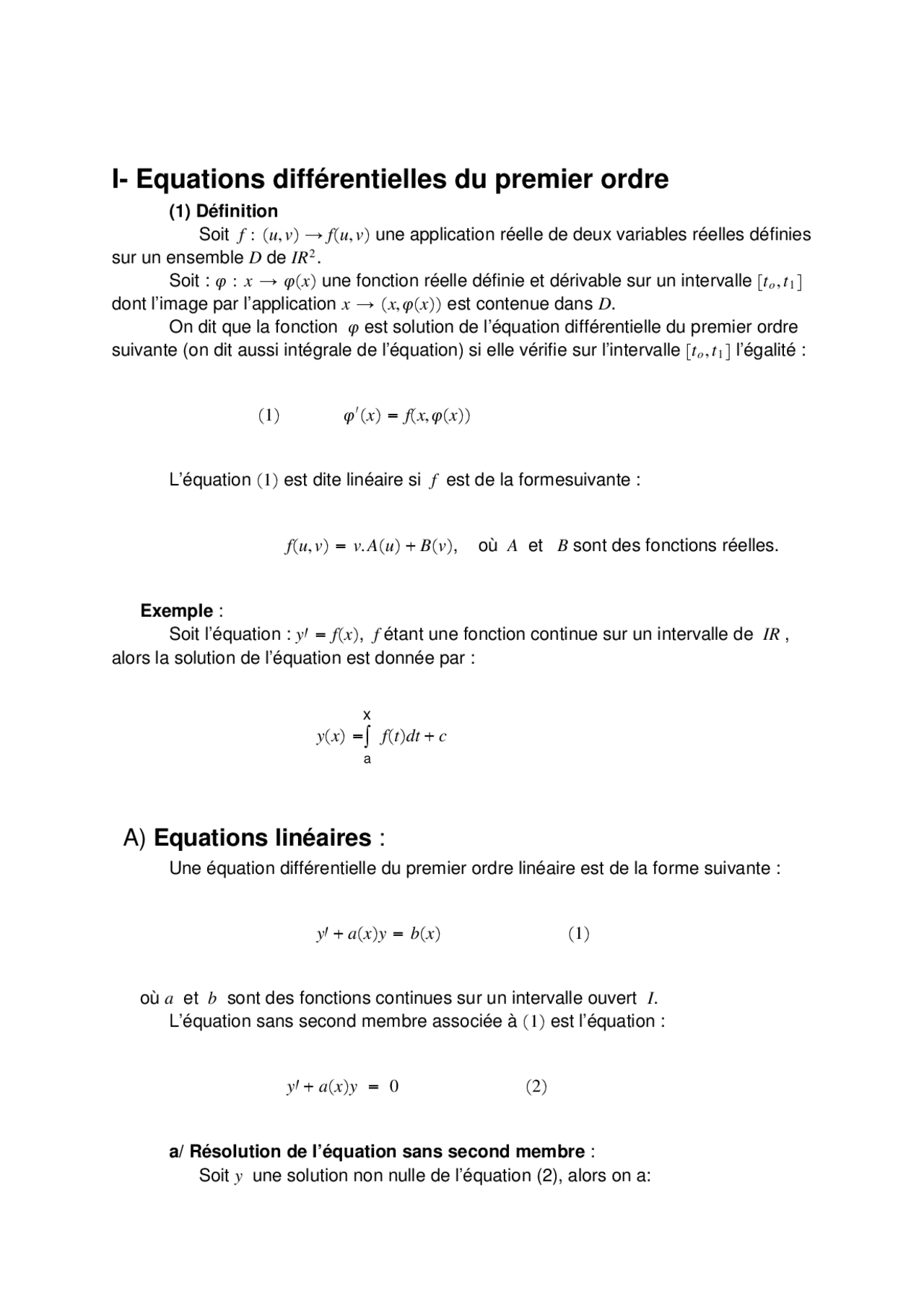 Découvrir les équations différentielles du premier ordre. Résoudre à la main et à l'aide de la calculatrice les équations différentielles linéaires du premier ordre. Exercice 1: on considère l'égalité suivante (E) : y'(x) = y(x) qui est une équation différentielle du premier ordre. On pourra écrire cette équation sous la.