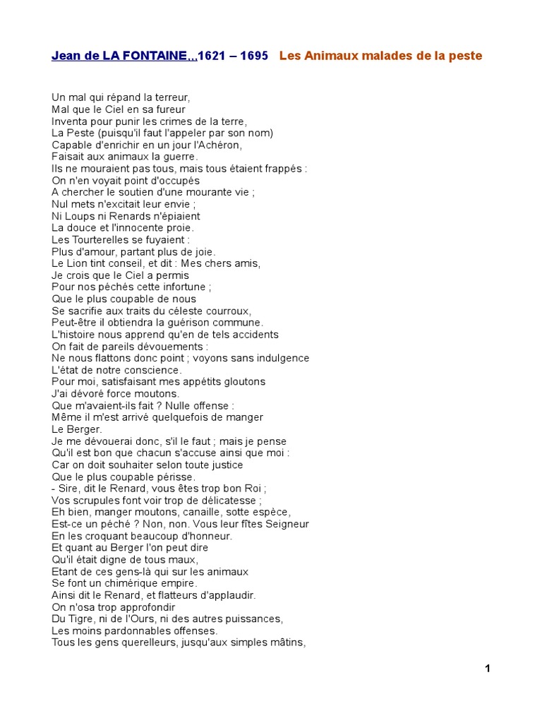Les Animaux malades de la peste Un mal qui répand la terreur, Mal que le Ciel en sa fureur Inventa pour punir les crimes de la terre, La Peste (puisqu'il faut l'appeler par son nom) Capable d'enrichir en un jour l'Achéron, Faisait aux animaux la guerre. Ils ne mouraient pas tous, mais tous étaient frappés : On n'en voyait point d'occupés