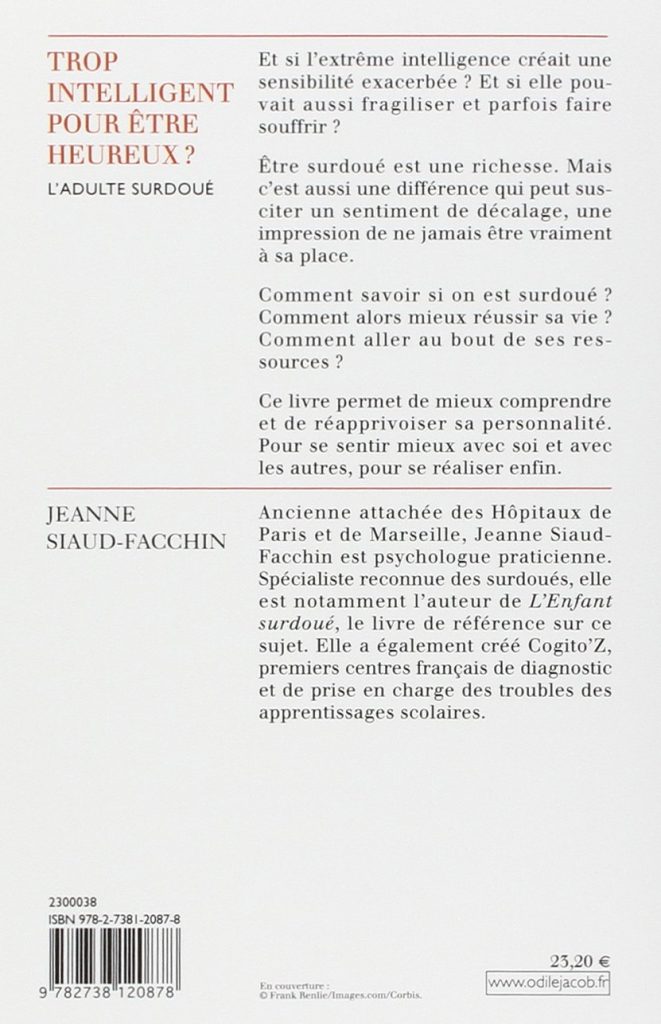 Nous suivre. EAN13 : 9782738120878. 320 pages. 145 x 220 mm. 23.90 € Ebook PDF. Ebook EPUB. Jeanne Siaud-Facchin. Trop intelligent pour être heureux ? L'adulte surdoué Date de parution : 13 mars 2008. local_library Feuilleter cet ouvrage. Et si l'extrême intelligence créait une sensibilité exacerbée ?
