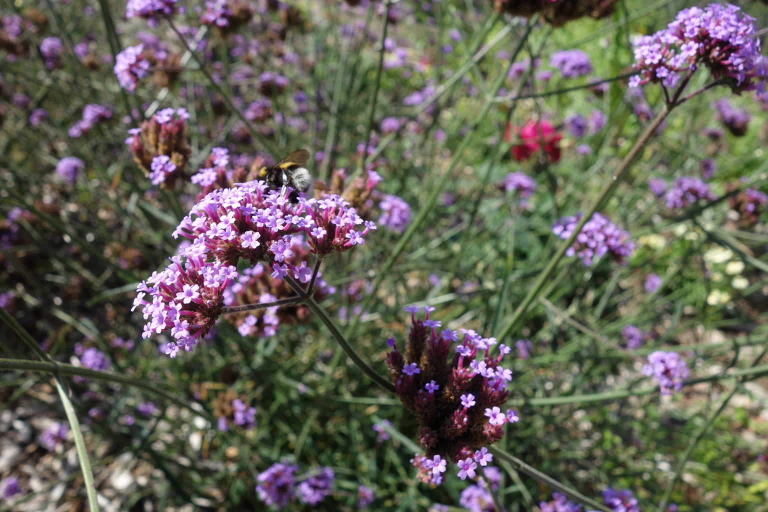 verveines de Buenos Aires. Elle est indispensable dans les jardins naturels, les massifs champêtres et même les jardins secs, caillouteux, les sols ingrats…. Elle se contente de très peu mais elle est inépuisable! De juin à octobre, les minuscules fleurs tubulaires, en panicules de 3 à 6 cm, voient virevolter les butineurs en goguette.